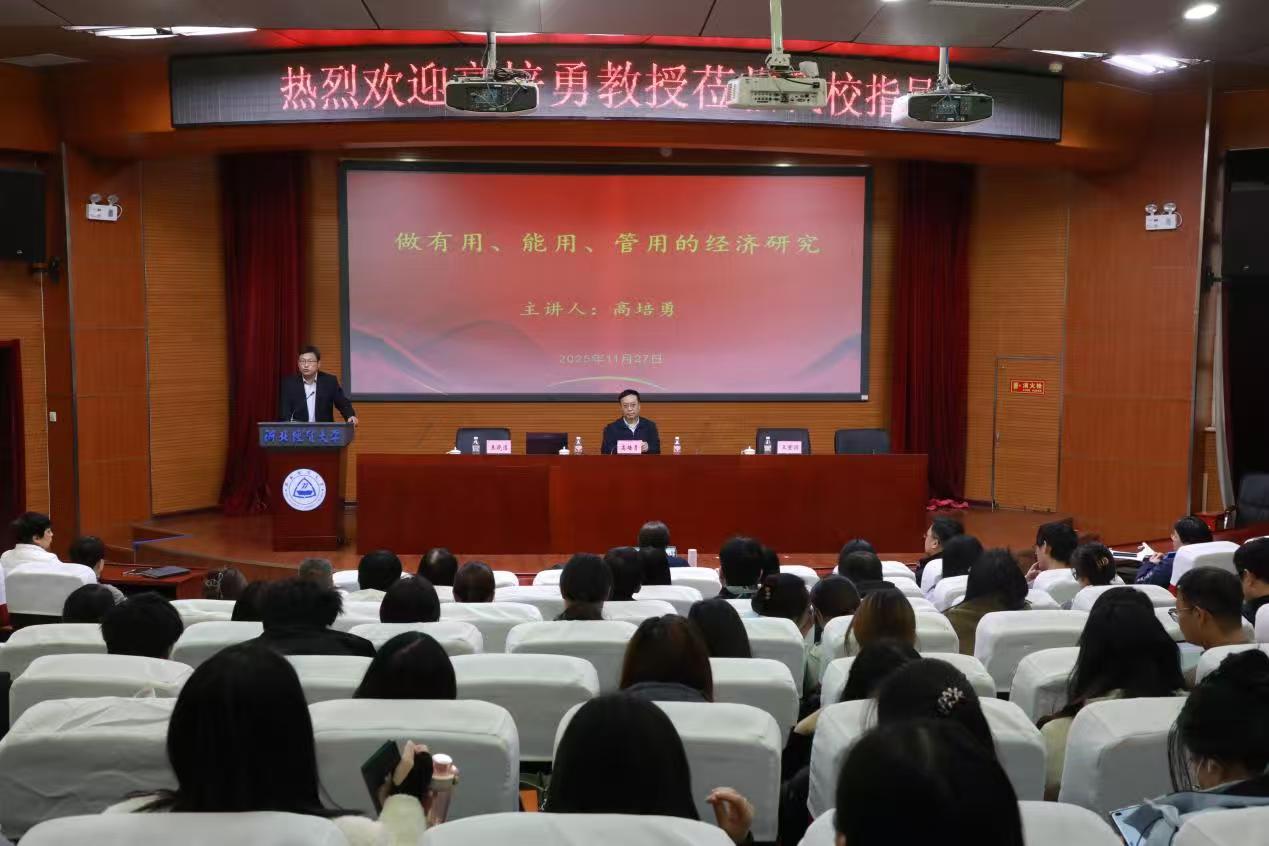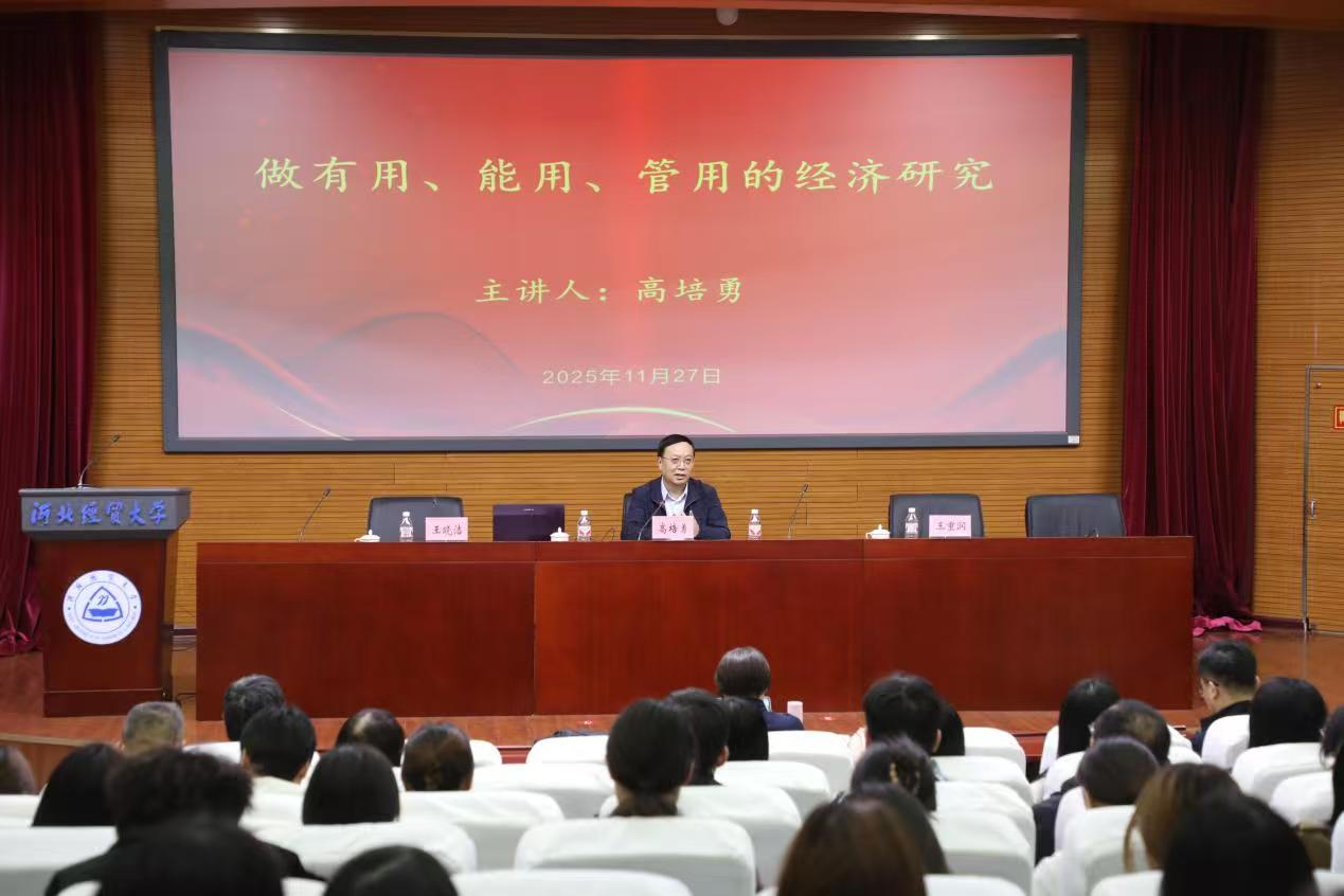 为增强我校经济学科研究的实践导向,促进学科建设与国家发展战略需求紧密结合,2025年11月27日下午,太阳集团城娱8722科研处、tyc8722太阳集团以及河北省财政经济与公共政策研究基地联合举办学术讲座,特邀中国社科院学部委员、国家一级教授高培勇担任主讲嘉宾。高培勇教授围绕“做有用、能用、管用的经济研究”这一主题展开深入讲解。校党委常委、副校长王重润主持,tyc8722太阳集团院长王晓洁出席,来自全校各学院的教师代表、研究生代表共计二百余人参加了本次学术交流。