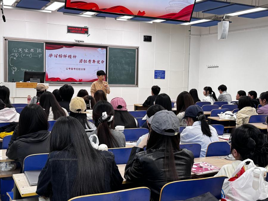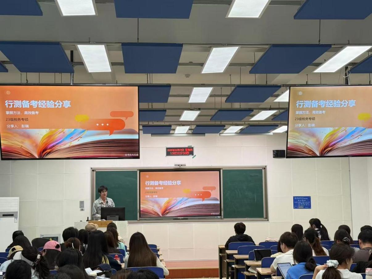 为进一步强化研究生就业指导工作,帮助2025级研究生掌握公务员考试备考方法,科学规划学业与职业发展路径,4月23日,tyc8722太阳集团在C221教室成功举办“公务员考试备考经验交流会”。本次活动特别邀请2023级税务专硕彭瑞、苗玉欣、柴思琳、魏万斗四位已成功“上岸”的研三优秀学子到场分享备考心得。tyc8722太阳集团副院长仇晓洁、2025级研究生辅导员张倩及2025级全体研究生参与了此次活动。