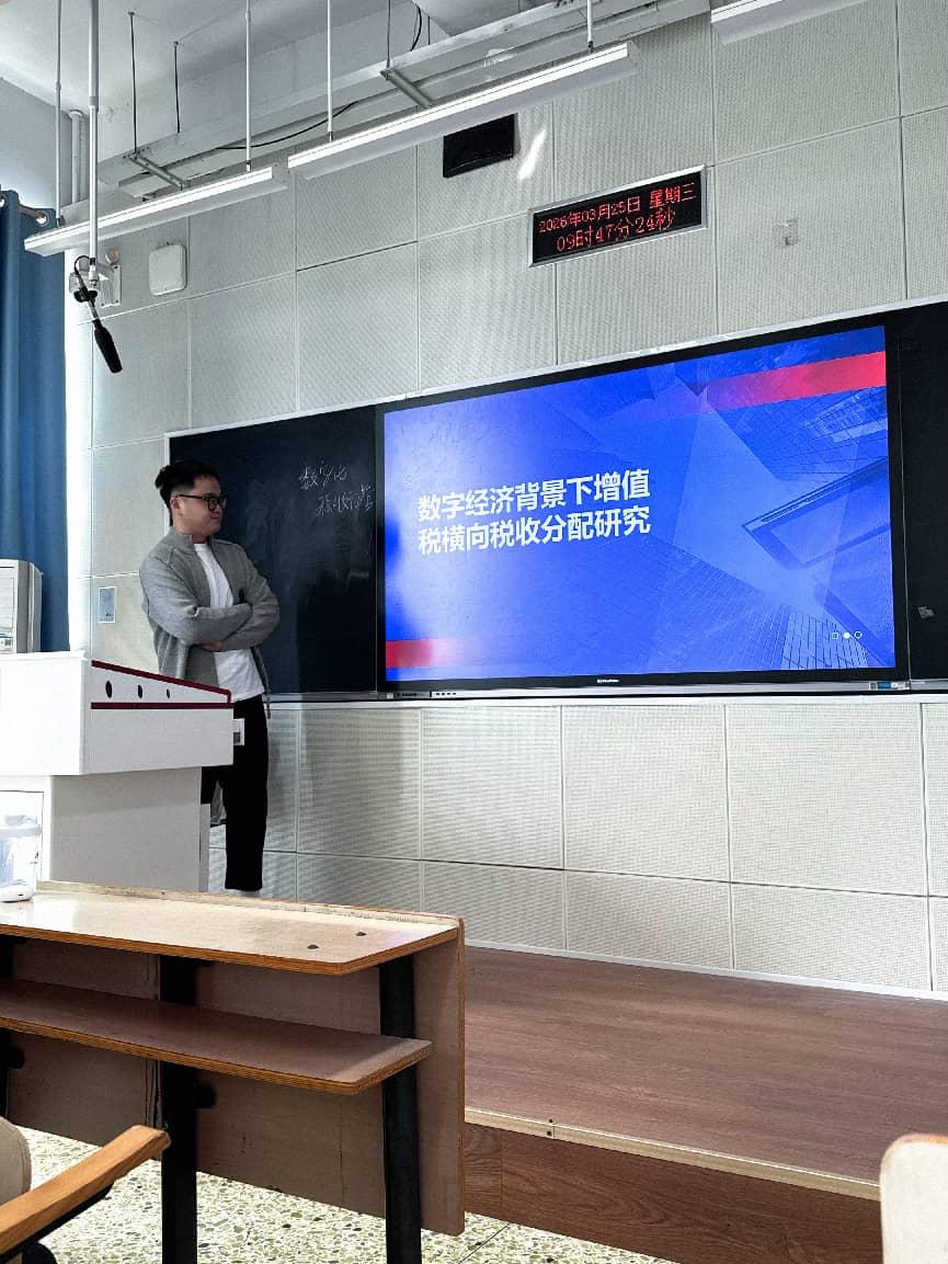 本次讲座以“十五五”规划纲要为现实依托,面向经济学、管理学等相关领域的师生,系统阐释数字经济新型生产组织形式(如平台经济、数据要素化、远程服务)与现行增值税区域间分配规则之间存在的制度性错配问题。岳文浩围绕“数字身份、价值溯源、分配关系和区域协调发展”这四大核心模块,着重讲解了数字经济怎样通过改变价值创造链条、重塑企业组织形态,进而对增值税税基的空间分布产生影响,以深入理解数字经济发展背景下税收跨地区流转的内在逻辑。