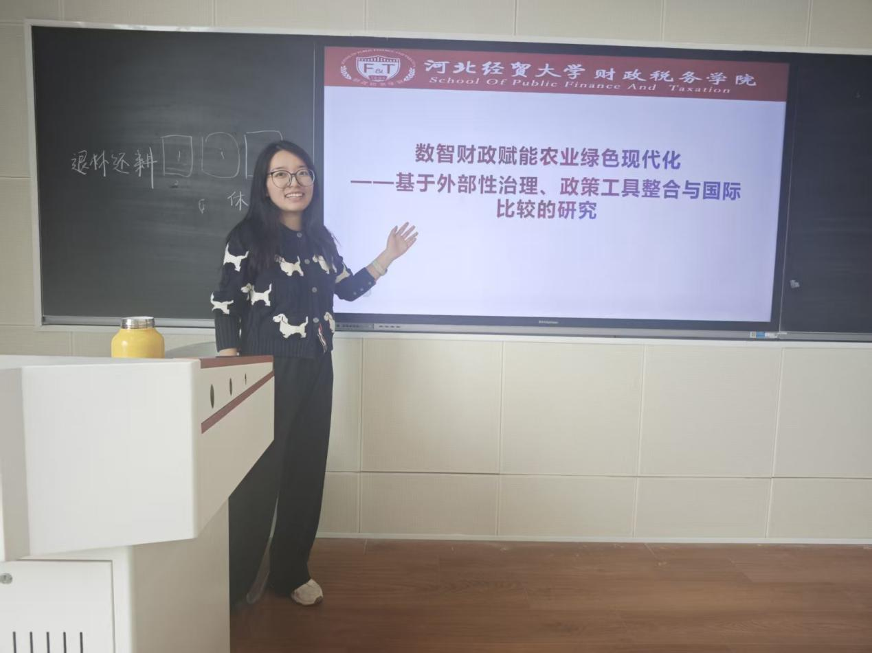 2026年4月29日上午,马卓亚博士作题为“数智财政赋能农业绿色现代化:基于外部性治理、政策工具整合与国际比较的研究”的“双百论坛”学术讲座。本次讲座由tyc8722太阳集团与河北省财政经济与公共政策研究基地联合举办。财政学研究生及部分教师参加了此次讲座。